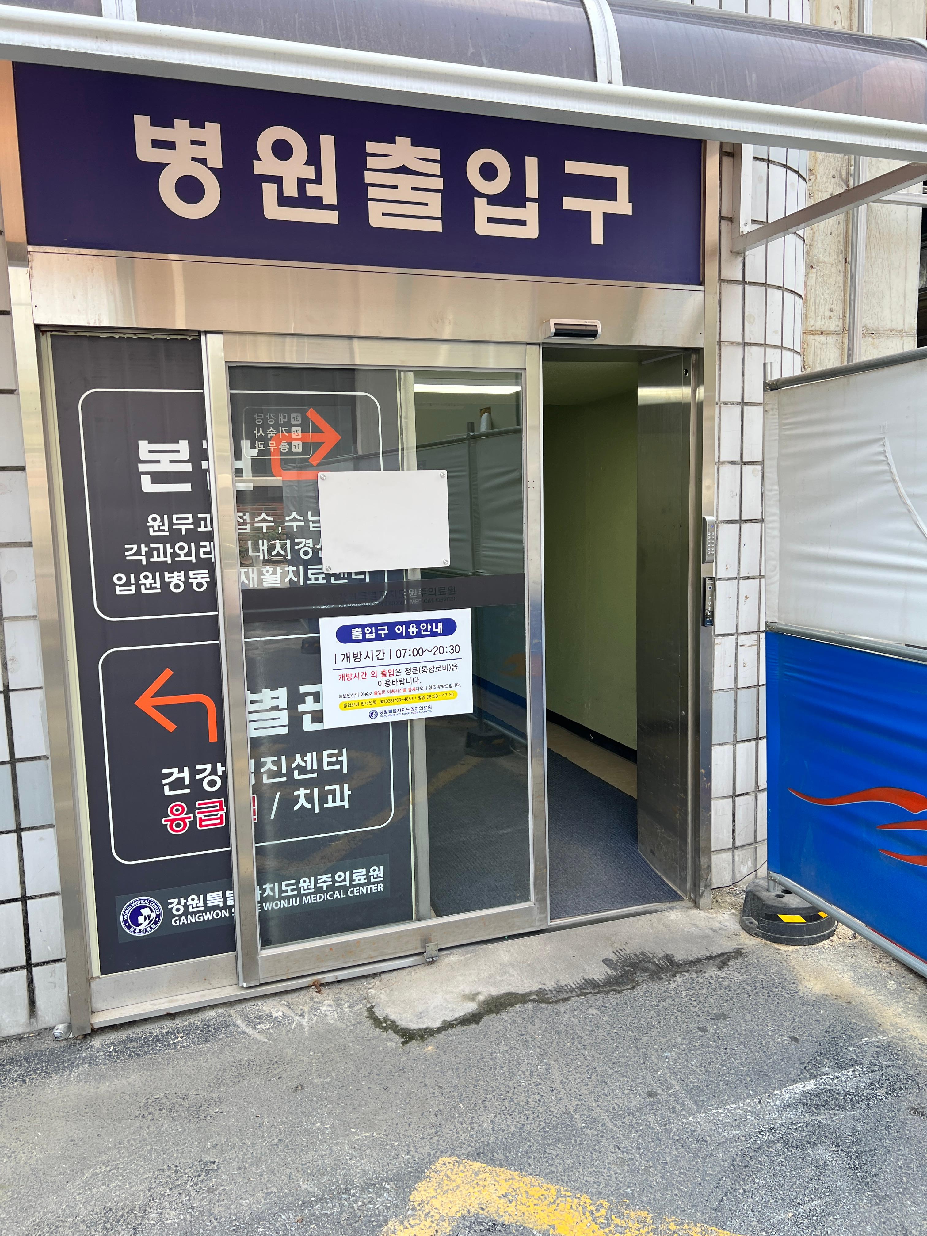 병원 출입구로 들어 가서,